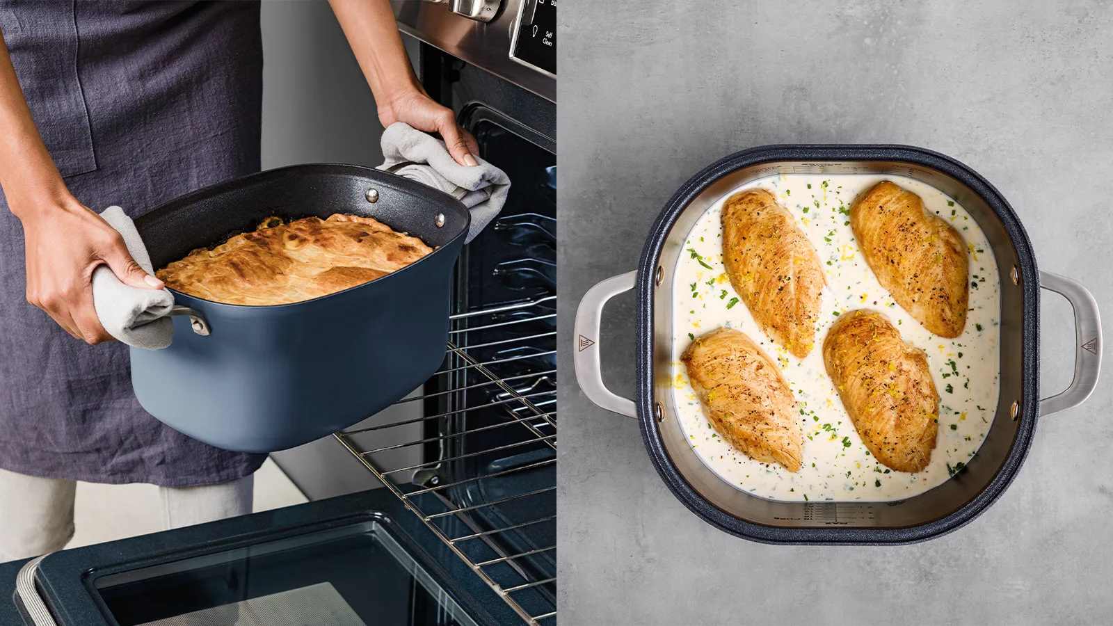 - Koken als op een kookplaat in één pan: Braad aan en sauteer in de pan en kook vervolgens langzaam voor een maaltijd uit één pan met een vollere smaak